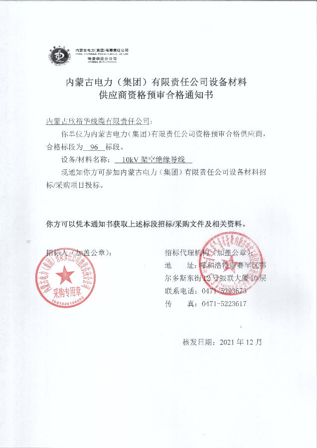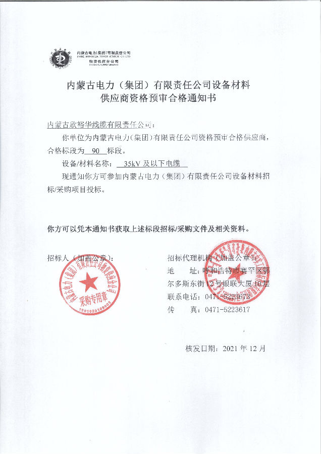 內(nèi)蒙古電力(集團(tuán))材料供應(yīng)商資格預(yù)審合格通知書(shū)