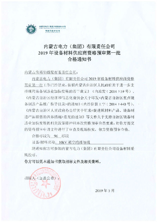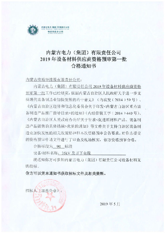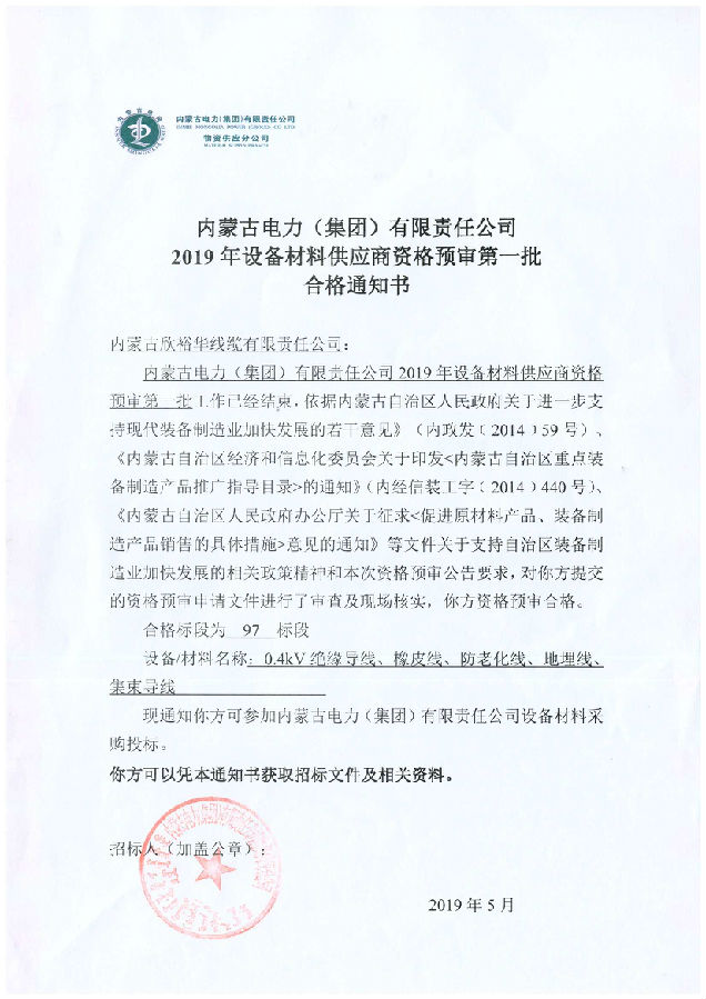 內(nèi)蒙古電力(集團(tuán))材料供應(yīng)商資格預(yù)審合格通知書
